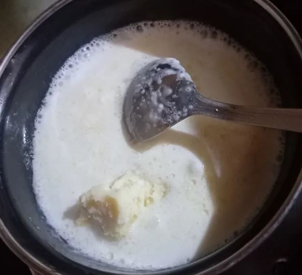 - दूसरी तरफ कढ़ाई में पानी उबालें और उसमें देसी घी डालें।